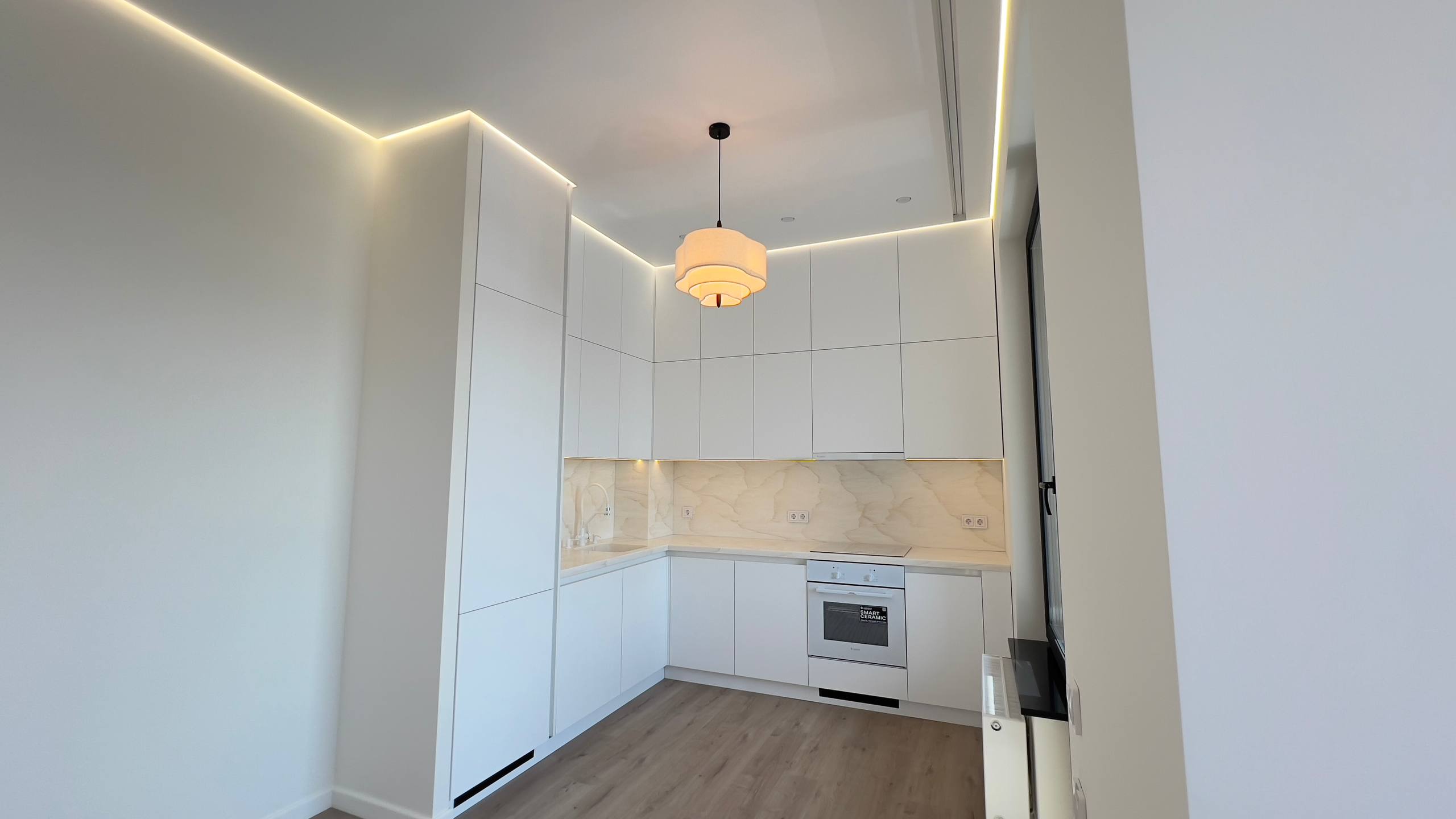 Долго выбирали вариант для гостиной и остановились на световых потолках. Сразу видно разницу по сравнению с установкой обычного потолка — интерьер стал современным и стильным. Мастера предложили сделать двухуровневый потолок с аккуратно встроенной световой лентой. Работы начали с подготовки чернового потолка, потом выровняли поверхность потолка и приступили к профессиональному процессу монтажа потолков. Итог — идеально натянутое полотно без складок, качество впечатляет.